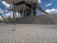 City life in Germany captured in modern architecture and urban design. Cobblestone streets with open spaces contrast with the sleek surfaces of buildings. A cloudy day adds charm to the European cityscape.