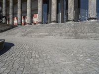 A boy sits on the steps of the Altes Museum in Berlin, Germany, observing stone statues and columns. The historic architecture and cobblestone road surface showcase the charm of the city. A peaceful day in this European tourist attraction.