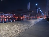 A nighttime view of the city of Bremen in Germany. The modern architecture and residential buildings are illuminated with artificial light. The city's harbor with boats and a jetty can be seen in the background, contrasting with the clear sky above.