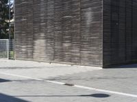 Man on skateboard leaning against a modern wood wall in a German city. The urban design incorporates open spaces and shaded areas. Grey asphalt road surfaces contrast with the surrounding vegetation. A snapshot of modern European architecture.