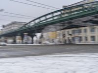 A winter day in Berlin, Germany. Snow covers the city, creating a serene atmosphere. The motion blur of vehicles on the asphalt road adds a sense of movement to the urban landscape. Bridges and underpasses dot the cityscape under a grey sky.