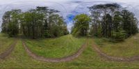 A scenic landscape in Germany. A straight dirt road cuts through a lush forest, surrounded by greenery. The clear blue sky and spherical pictures add a touch of artistry to the scene.
