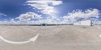 A straight road in Berlin, Germany, surrounded by modern architecture and industrial buildings. The clear sky and clouds create a striking contrast against the concrete street. The foreground features an open space with parking decks and warehouses.