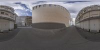 A snapshot of metropolitan Berlin, showcasing its modern architecture and urban design. The monochromatic image captures the straight roads lined with curved buildings, creating a unique cityscape. The fish eye lens adds an artistic touch to this bustling European metropolis.