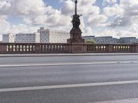 A cyclist rides across a modern bridge in Berlin, Germany. Clear skies highlight the city's contemporary architecture and urban landscape. Street lights illuminate the road as traffic passes by. A sunny day in Europe.