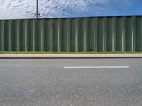 This is an image of a road in Bremen, Germany. The asphalt road surface stretches through the picture, bordered by green grass on either side. A rectangular fence lines the road, with a clear blue sky and fluffy white clouds above. The color palette is dominated by shades of grey, reflecting the urban landscape. This photo represents a typical day in Bremen, Europe, where the road and surrounding environment are captured in profile.