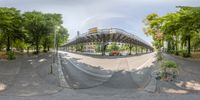 Panoramic view of Berlin's urban landscape in Germany. Clear sky illuminates the vibrant city with its unique architecture and art districts. Pedestrian walkway leads to a bustling street in Kreuzberg.