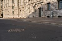 A classic architecture building in Berlin, Germany. The city's urban landscape is highlighted by the asphalt road and the hard shadows cast during the day. An iconic image of Europe's architecture.