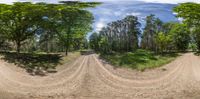 A lush green landscape in Brandenburg, Germany. Two identical fisheye photographs showcase the straight dirt roads surrounded by forests and grass. The road has been recently paved, providing an off-road track for nature enthusiasts.