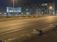 Night scene in Berlin, Germany, showcasing the city's modern architecture. Office buildings and business districts are illuminated by streetlights. The road surface and infrastructure leading to a bridge create a striking urban landscape.
