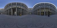 the three circular glass windows are visible at this building in the picture is a view of the walkways