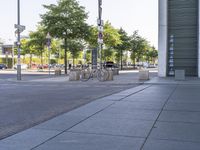A modern office building in Berlin, Germany. The glass walls reflect the clear sky, showcasing the city's impressive architecture. The urban landscape is lined with trees, creating a vibrant and bustling business district.