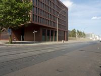 A modern three-story office building in Berlin's business district. The clear sky reflects on the building's glass facade. Cars line the urban street, adding to the city's vibrant atmosphere.