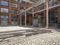 A sunny day in Berlin, Germany. The cityscape showcases a mix of architectural styles, from traditional brick buildings to modern industrial warehouses. Cobblestone streets and open courtyards add to the urban charm of this European art district.