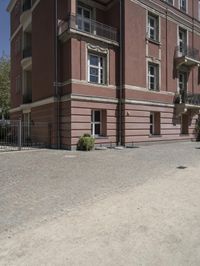 A woman walks across a gravel driveway in Berlin, Germany, surrounded by classic architecture. The residential buildings and cobblestone surface evoke the charm of city life in Europe.