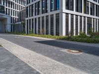 Berlin's business district showcasing modern architecture and urban design. Cobble stone roads with hard shadows contrast with the sleek office buildings. A quintessential day in Germany's vibrant city life.