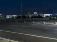 A night scene in Berlin, Germany showcasing modern architecture and city streets illuminated by street lights. The clear sky provides a backdrop for the city's urban design. The dark streets contrast with the artificial light from buildings.