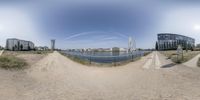 A fish-eye view of a city in Germany, with a river and town in the foreground. The beach and clear sky in the background add to the picturesque landscape. Modern architecture and high-rise buildings dot the cityscape.