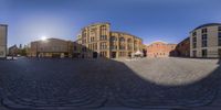 A wide view of Berlin, Germany captured through a fish-eye lens. The city's classic architecture and cobblestone roads blend with modern infrastructure. Open spaces, courtyards, and town squares provide a glimpse into Berlin's vibrant city life.