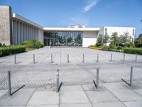 This is an image of a modern architecture office building on a sunny day in Berlin, Germany. The clear sky contrasts with the sleek and stylish design of the building. The cobblestone road in front adds to the charm of the city. This photo represents the modern infrastructure and business district of Berlin, as well as the cultural and historical architecture that can be found throughout Europe. It could also be a representation of a university campus or a museum in the financial district of Berlin.