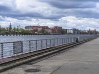 A modern architecture office building in Berlin, Germany, overlooking a river and harbor. The bridge and jetty provide a stunning view of the city's skyline. The road and fence create a sleek and urban aesthetic.