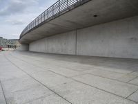 This is an image of a modern concrete bridge in Berlin, Germany. The bridge spans over a body of water, reflecting the clear sky above. The grey urban landscape showcases the city's modern architecture and urban design. The asphalt road surface and curbs provide a contrast to the surrounding city life. This photo captures a typical day in Berlin, highlighting the city's composite material infrastructure.