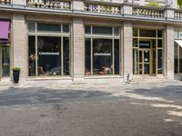 Classic architecture in Berlin, Germany. A large shop front window with a glass and white facade stands empty. The town road and open space create a charming backdrop for this European storefront.