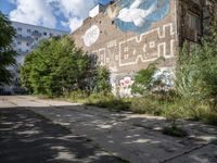 A vibrant graffiti-covered wall in Berlin's urban art district. The rugged concrete surface tells the story of the city's history. The courtyard is a unique open space for urban design enthusiasts to explore.