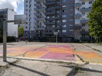 An urban basketball court painted in bright colors on a Berlin city street. Graffiti-covered walls and rugged surfaces add to the urban design of the area. The open space invites sport and recreation in this vibrant art district.