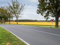 This image captures the beauty of the German countryside in autumn. A country road stretches ahead, lined with vibrant trees and lush yellow grass. The clear sky above highlights the natural landscape of Europe. In the distance, an empty street sign awaits travelers. This serene scene represents the harmony between agriculture and nature in Germany. Explore the open road and immerse yourself in the picturesque beauty of the Berlin countryside.