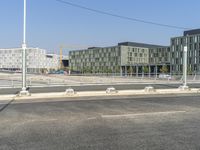 A view of Berlin's modern architecture in the business district. High-rise office buildings line the asphalt roads, illuminated by street lights. The urban design blends seamlessly with the city's residential areas, creating a vibrant and bustling atmosphere.