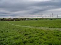 A lush green field in rural Germany, with windmills in the distance under a cloudy sky. The picturesque landscape captures the beauty of Europe's natural environment.