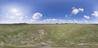 Sunny day in Brandenburg, Germany, showcasing vast greenery and open spaces. The sun visible in clear skies illuminates the grass surface. A serene landscape capturing the essence of nature.