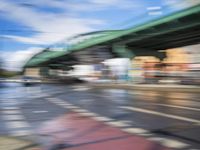 A view of a wet street in Berlin, Germany. The clear sky illuminates the city's metropolitan landscape. The patterned bridge blends with the motion-blurred cars, showcasing the vibrant automotive design. An urban scene with shades of tints and shades.