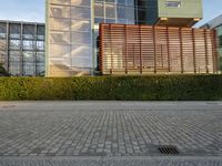 A modern office building in Berlin, Germany. The building features a unique facade with wood slat fencing for added security. Located in a bustling business district, this property is a reflection of the city's vibrant and innovative architecture.
