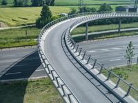 A modern architecture bridge in Germany, elevated above a well-manicured grassy landscape. The road surface made of composite material leads to an underpass. Clear sky and high lines add to the urban design.