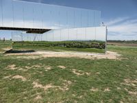 A modern architectural masterpiece in Germany surrounded by lush green fields and open spaces. The sculpture stands prominently against the clear sky, creating a harmonious blend of art and nature.
