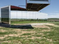 A modern architectural marvel in Germany, reflecting the clear sky in its mirror glass façade. The building stands at the entrance of a lush green grassy area, surrounded by open space and rural landscapes.