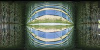 In a picturesque city in Germany, a modern architectural marvel stands tall next to a serene river. The reflection of the green structure and surrounding trees creates a mesmerizing image in the clear sky.