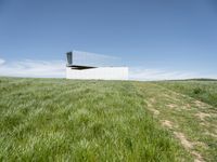 A modern architecture sculpture in Germany, set against a lush green landscape. The mirror-like container reflects the clear sky and incidental people on the road. A perfect blend of art and nature in rural Europe.