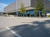 A modern cityscape in Berlin, Germany. Clear skies cast shadows on the concrete streets and buildings. Trees line the road, providing shade. The urban design and architecture showcase the vibrant city life of Europe.