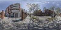 a fish eye lens is taking a photo of a paved area and buildings and a car
