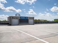 Modern architecture of Berlin. A concrete street leads to a parking deck full of parked cars. Clear sky and clouds create a perfect backdrop. Trees provide shade to the surrounding landscape.
