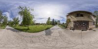 A person riding a skateboard on a cement surface in front of a house in Germany. The residential area is surrounded by lush green vegetation and clear skies. The straight road leads to a picturesque landscape.