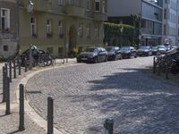 A classic cobblestone street in Berlin, Germany, lined with tall residential buildings. Shadows of the buildings cast on the pavement where several parked cars are seen. This urban scene showcases the city's architectural charm.