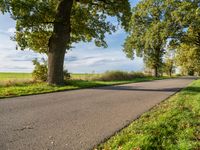 This image captures the beauty of Berlin, Germany on a sunny autumn day. The landscape features a road with lush vegetation on the sides, surrounded by trees displaying shades of green and yellow. The clear sky is reflected in the calm surface of the road, which is made of asphalt. This photo represents the peacefulness of the European countryside and the harmonious coexistence of nature and civilization.