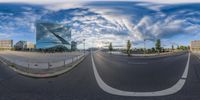 A fisheye view of a road in Berlin, Germany during daylight. Modern architecture lines the street, with high-rise buildings and glass facades. The clear sky and sunlight create a vibrant cityscape.