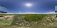 360 panorama view looking up at green field and blue sky with white clouds and a clock tower