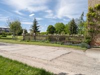 This stock photo captures a scenic view of the rural landscape in Germany. The clear sky overhead highlights the lush greenery surrounding the area. The photograph shows a sidewalk outside a building that has been beautifully incorporated into a garden area in front of it. The road, made of concrete and gravel, adds to the rustic atmosphere of the countryside. The barn, shed, and house in the distance depict a tranquil and harmonious environment. The image perfectly represents the natural beauty and agricultural charm of Germany, blending nature and human habitation seamlessly.