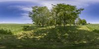 A picturesque rural landscape in Germany, with a field filled with trees and lush green grass. The bright blue sky and fluffy cumulus clouds create a stunning contrast. The perfect European open space.